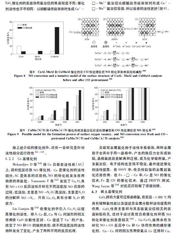 在CeTi 催化劑中,Ce 和Ti 在原子級(jí)別上的相互作用產(chǎn)生的Ce - O - Ti 有助于提高催化劑活性。Li Ping 等[75]用FETEM 直接觀察到Ce - O - Ti 結(jié)構(gòu),無定型Ce0. 3 TiO∞在( 175 ~ 400) ℃ 時(shí)的NO 轉(zhuǎn)化率為90%。此外,利用XANES 和原位FTIR 等證明了表面高度分散的Ce - O - Ti 結(jié)構(gòu)是反應(yīng)的活性中心。Chen Lei 等 利用溶膠- 凝膠法合成CuCeTi 催化劑,在( 150 ~ 250) ℃時(shí)的NO 轉(zhuǎn)化率大于80%,Cu 提供的L 酸位點(diǎn)成為反應(yīng)的活性中心,加速了低溫段快速SCR 反應(yīng)過程。在此基礎(chǔ)上進(jìn)行改進(jìn)( 圖5) ,在Ce - Ti 催化劑中摻雜了少量Cu2 + ,可以顯著提高催化劑的低溫SCR 活性。研究表明,Cu 與Ce 物質(zhì)的量比0. 005 時(shí),( 200 ~400) ℃的NO 轉(zhuǎn)化率為80%,N2選擇性為100%。Cu - O - Ce 的形成促進(jìn)了Ce4 + 向Ce3 + 的轉(zhuǎn)化,增加了表面活性氧。分散態(tài)Cu 增加了Ce -Ti 催化劑表面酸性,提高了NH3吸附能力,從而加速了反應(yīng)向E - R 機(jī)理方向進(jìn)行。在Ce - Ti 催化劑中摻雜W 可以在Ce - W 間產(chǎn)生強(qiáng)烈的相互作用,產(chǎn)生更多的Ce3 +、NOx 和NH3吸附物種,從而提高催化劑活性。Fu Mengfan 等發(fā)現(xiàn),采用共浸漬法時(shí),在( 200 ~ 400) ℃ 的NO 轉(zhuǎn)化率大于90%。利用均相沉淀法進(jìn)一步提高了Ce -W - Ti 催化劑在高空速下的活性,在Ce 與W 物質(zhì)的量比1∶ 1、空速500 000 h - 1和溫度( 275 ~ 400) ℃條件下,NO 轉(zhuǎn)化率為90%。W 的引入促進(jìn)了活性Ce 的分散,增加了催化劑表面活性CeO2晶體、氧空位和酸位。在低溫段( < 300 ℃) ,W 促進(jìn)了NO 向NO2的氧化,在高溫段( > 300 ℃) ,W 提高了N2選擇性。