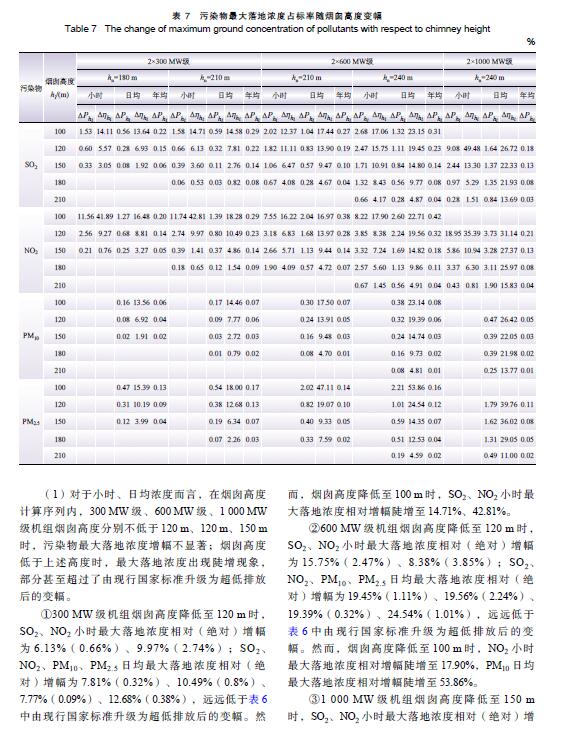 摘 要:燃煤電廠全面實施超低排放后,煙氣污染物排放水平大幅降低,是否仍需采用高煙囪排放已引起關注。以平原區不同容量燃煤電廠為例,對超低排放水平下煙囪高度與污染物最大落地濃度關系進行研究,并對特定高度下是否出現建筑物下洗進行判定,分析煙囪高度優化的可能性。研究結果表明:平原區燃煤電廠執行超低排放限值后,300 MW、600 MW、1 000 MW級機組煙囪從現有推薦高度分別降低至130 m、140 m、150 m時,污染物最大落地濃度增幅不顯著,初步判定污染物增加幅度可接受且不會出現建筑物下洗,煙囪高度存在優化降低的空間。